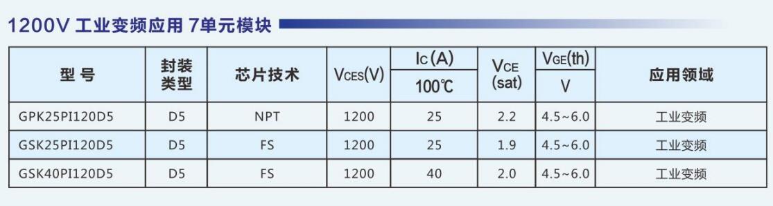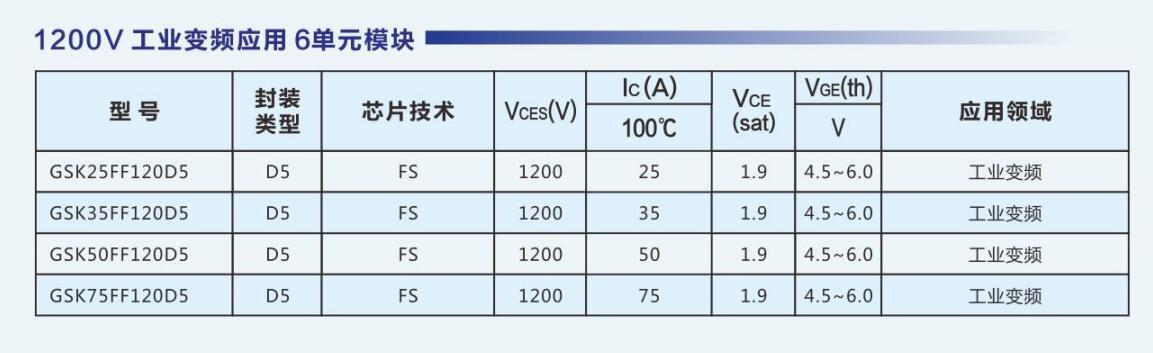 达新半导体采用自主IGBT芯片,推出了系列化的满足工业应用、消费电子、新能源的IGBT模块,模块电压涵盖600V~1700V,电流等级涵盖10A ~ 800A。公司IGBT产品可广泛应用于白色家电、逆变焊机、工业变频、感应加热、大功率电源、UPS、新能源汽车、太阳能/风力发电、SVG等领域。GSK15PJ120E1,GSK25PJ120E2,GSK25PI120D5,GSK35PJ120E2,GSK35PI120D5,GSK40PI120D5,GPK50PI120D6,GPK50PI120D61,GPK75PI120D6T4,GPK100PI120D6T4,GPK150FF120D6,GPK200HF120D2,GPK300HF120D2,GPU450HF120D2SE,GSK450HF120D2E,GSK450HF120D9E,GSK600HF120D9E,DXG15N120H,DXG25N120H,DXG40S120H,DXG40N65HS,DXG60N65HSEU,DXG75N65HS,DXG75N65HSN,SPS03NM15T3PH,SGT75T65SDM1P7,SGTP75V65SDB1P7,SGTP75V65FDB1P7,RG450HF170B2,MFDK400U18NACW