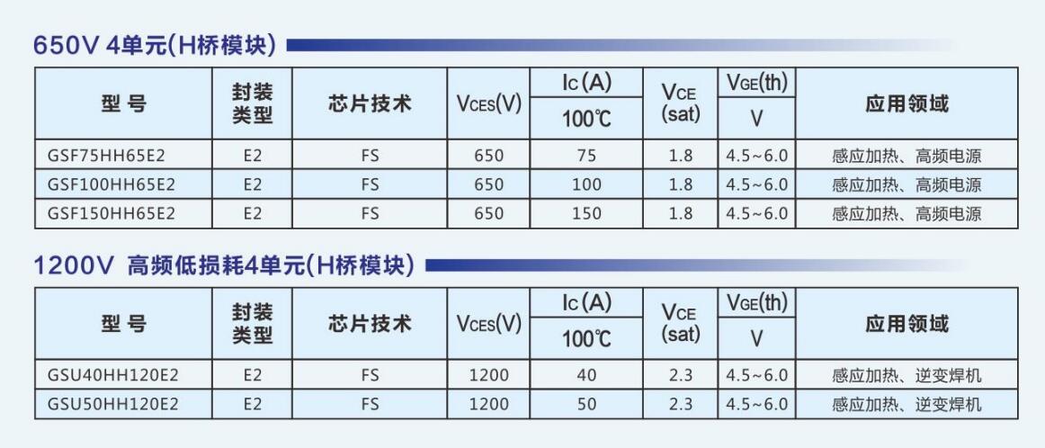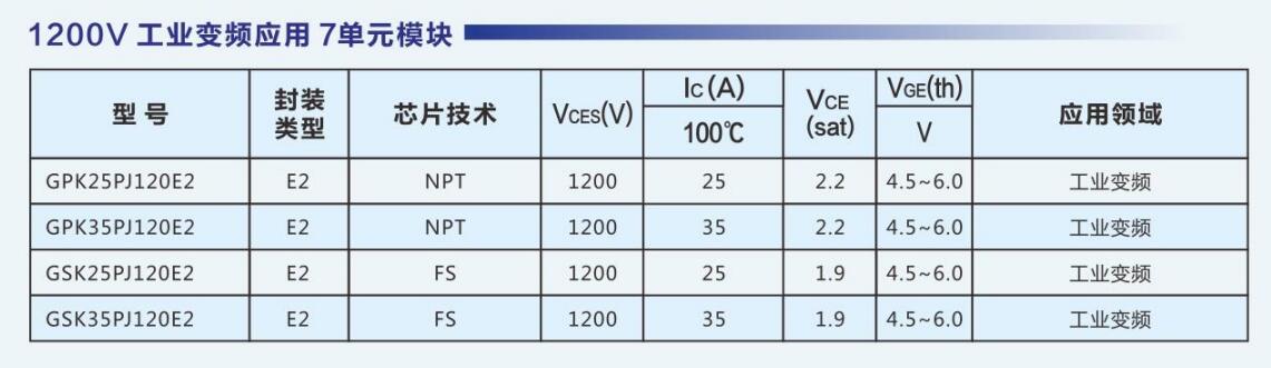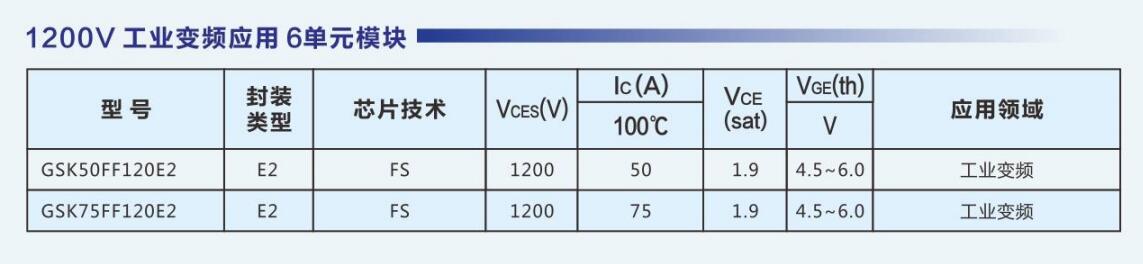 达新半导体采用自主IGBT芯片,推出了系列化的满足工业应用、消费电子、新能源的IGBT模块,模块电压涵盖600V~1700V,电流等级涵盖10A ~ 800A。公司IGBT产品可广泛应用于白色家电、逆变焊机、工业变频、感应加热、大功率电源、UPS、新能源汽车、太阳能/风力发电、SVG等领域。GSK15PJ120E1,GSK25PJ120E2,GSK25PI120D5,GSK35PJ120E2,GSK35PI120D5,GSK40PI120D5,GPK50PI120D6,GPK50PI120D61,GPK75PI120D6T4,GPK100PI120D6T4,GPK150FF120D6,GPK200HF120D2,GPK300HF120D2,GPU450HF120D2SE,GSK450HF120D2E,GSK450HF120D9E,GSK600HF120D9E,DXG15N120H,DXG25N120H,DXG40S120H,DXG40N65HS,DXG60N65HSEU,DXG75N65HS,DXG75N65HSN,SPS03NM15T3PH,SGT75T65SDM1P7,SGTP75V65SDB1P7,SGTP75V65FDB1P7,RG450HF170B2,MFDK400U18NACW